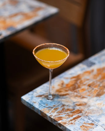 Pour l’infusion curcuma, gingembre, écorces d'orange, faites chauffer quelques morceaux de gingembre frais, une pincée de curcuma et des écorces d’orange dans de l’eau. Laissez infuser 10 à 15 minutes, puis laissez refroidir. Humidifiez le bord d’un verre coupette et trempez-le dans un mélange de sel fin et de piment doux (ou de piment d’Espelette). Dans un shaker rempli de glaçons, verser RHHM n°1, l’infusion refroidie, le vinaigre de cidre et le zeste d’orange. Shaker énergiquement, filtrer, puis verser dans le verre préparé.