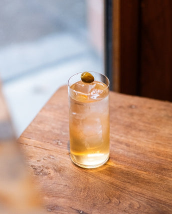 Dans un verre tumbler rempli de glaçons, verser JNPR n°1, les olives en saumur et ajouter quelques gouttes d’huile d’olive. Compléter avec un tonic sans sucre bien frais et remuez délicatement à l'aide d'une cuillère. Décorer d’une olive pour la touche finale.