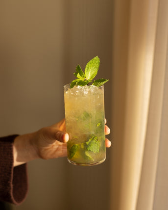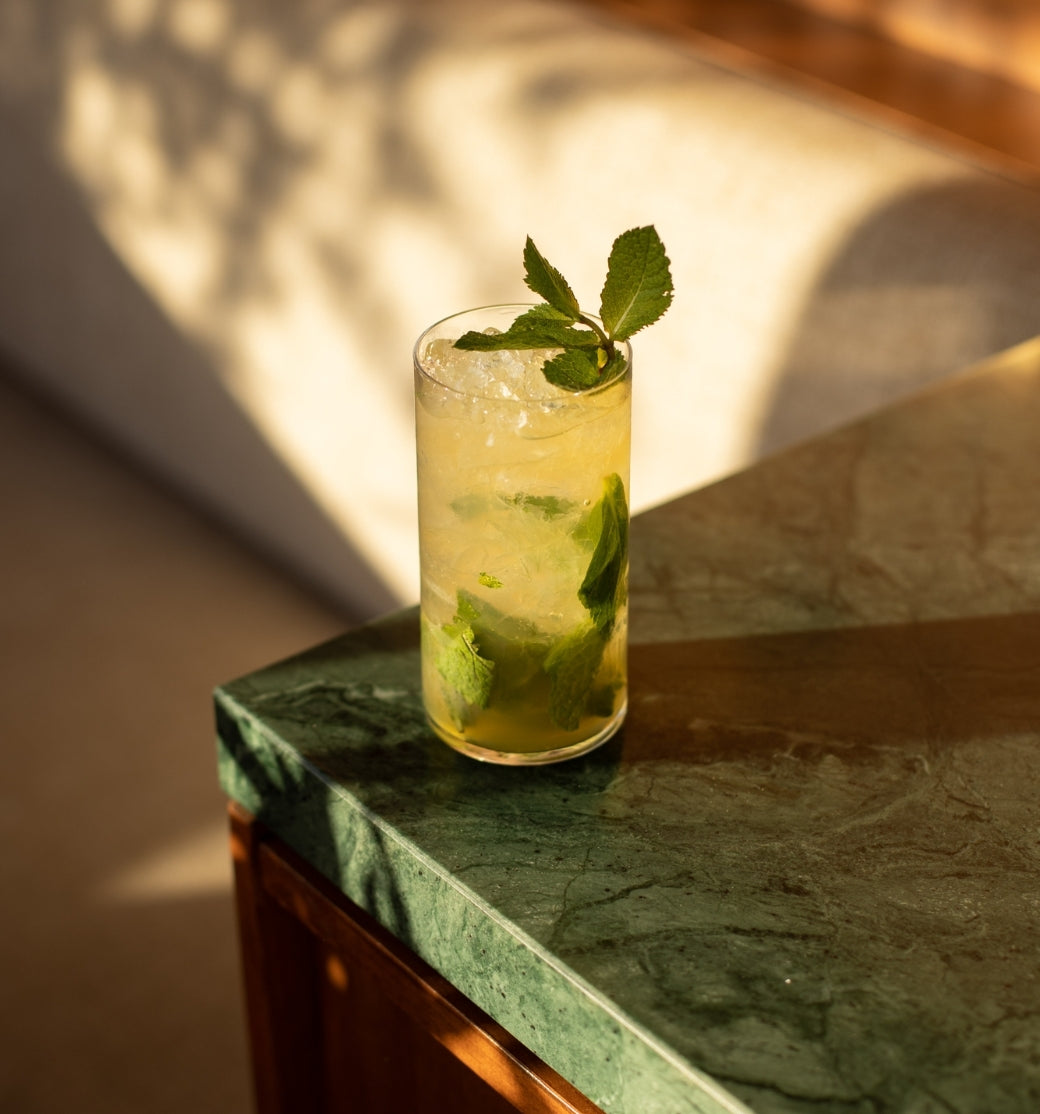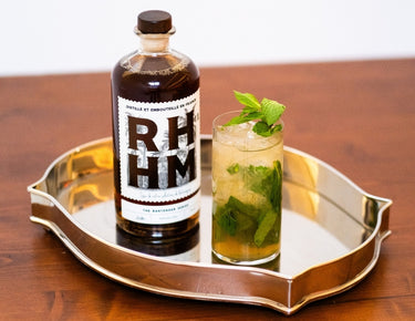 Dans un verre tumbler haut, déposez 6 à 8 feuilles de menthe préalablement lavées et légèrement frappées. Ajoutez le jus de citron vert et le sirop de sucre, puis écrasez délicatement les feuilles à l’aide d’un pilon pour libérer leurs arômes. Versez RHHM n°1, puis remplissez le verre de glace concassée. Complétez avec de l’eau gazeuse et mélangez délicatement à la cuillère. Décorez d’une feuille de menthe fraîche.